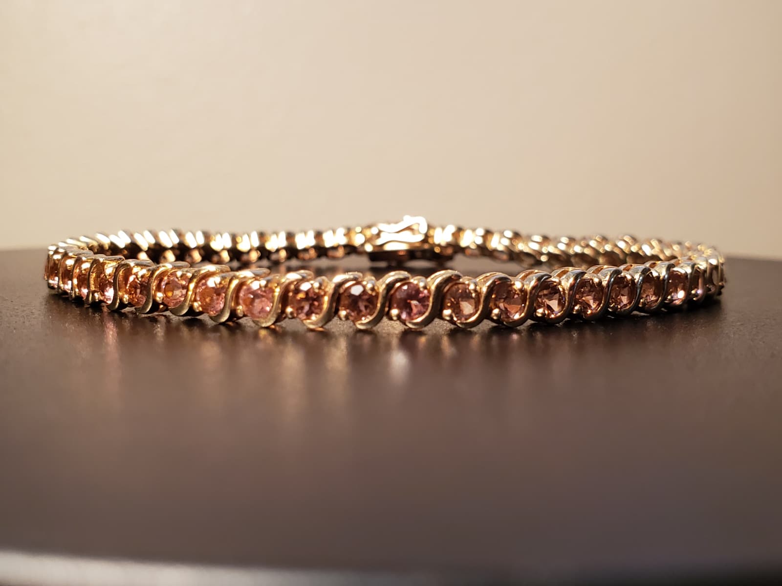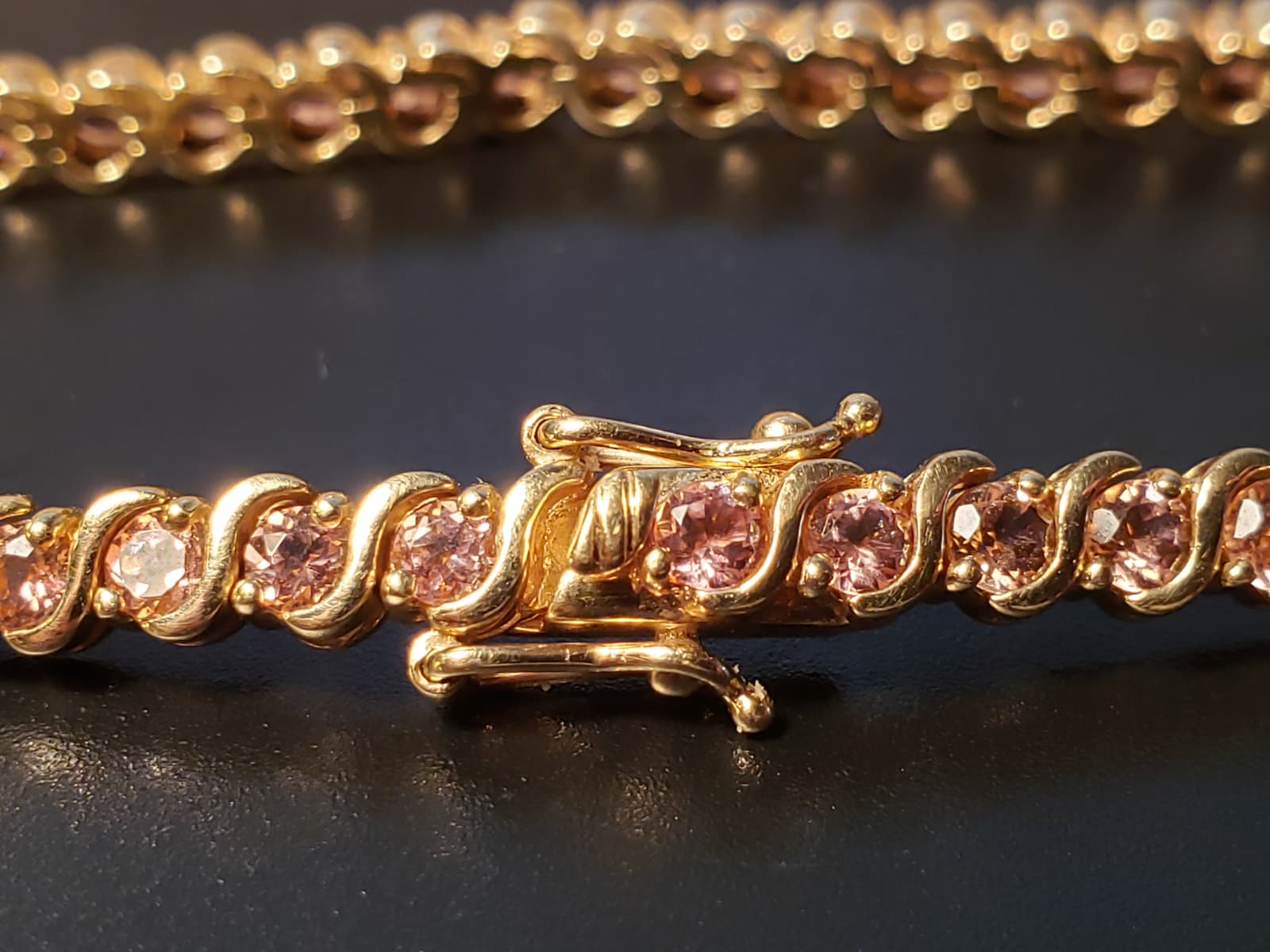 Pre owned 10 k tennis bracelet. Featuring round-cut pink topaz stones. The bracelet has a wavy or S-link design connecting the individual stone settings. It is secured with a box clasp and two figure-eight safety latches. 7.5" long and 3/6" wide.